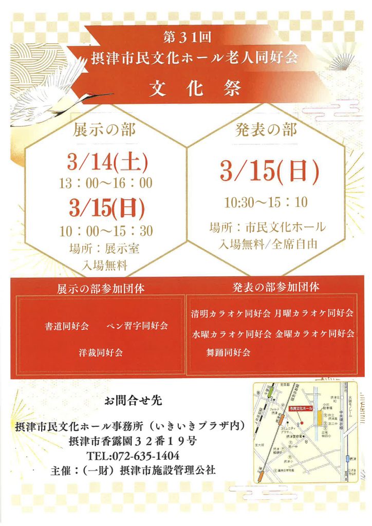 摂津市民文化ホール 老人同好会文化祭 【日時】 <展示の部> 3/14(土)13:00~16:00 3/15(日)10:00~15:30 <発表の部> 3/15(日)10:30~15:10 【場所】 <展示の部> 摂津市民文化ホール 展示室 <発表の部> 摂津市民文化ホール 【参加費】 無料(展示の部、発表の部とも) ※チラシのダウンロード(PDF)はこちらから 【お問い合わせ】 摂津市民文化ホール事務所(いきいきプラザ内) 072-635-1404